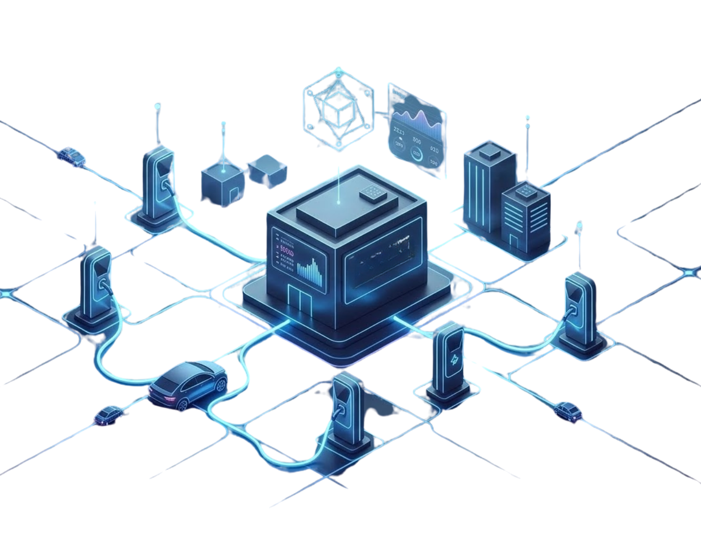Physics-informed digital twins of transformers, chargers, batteries, and PV systems. Continuous state estimation, health monitoring, and what-if simulation.